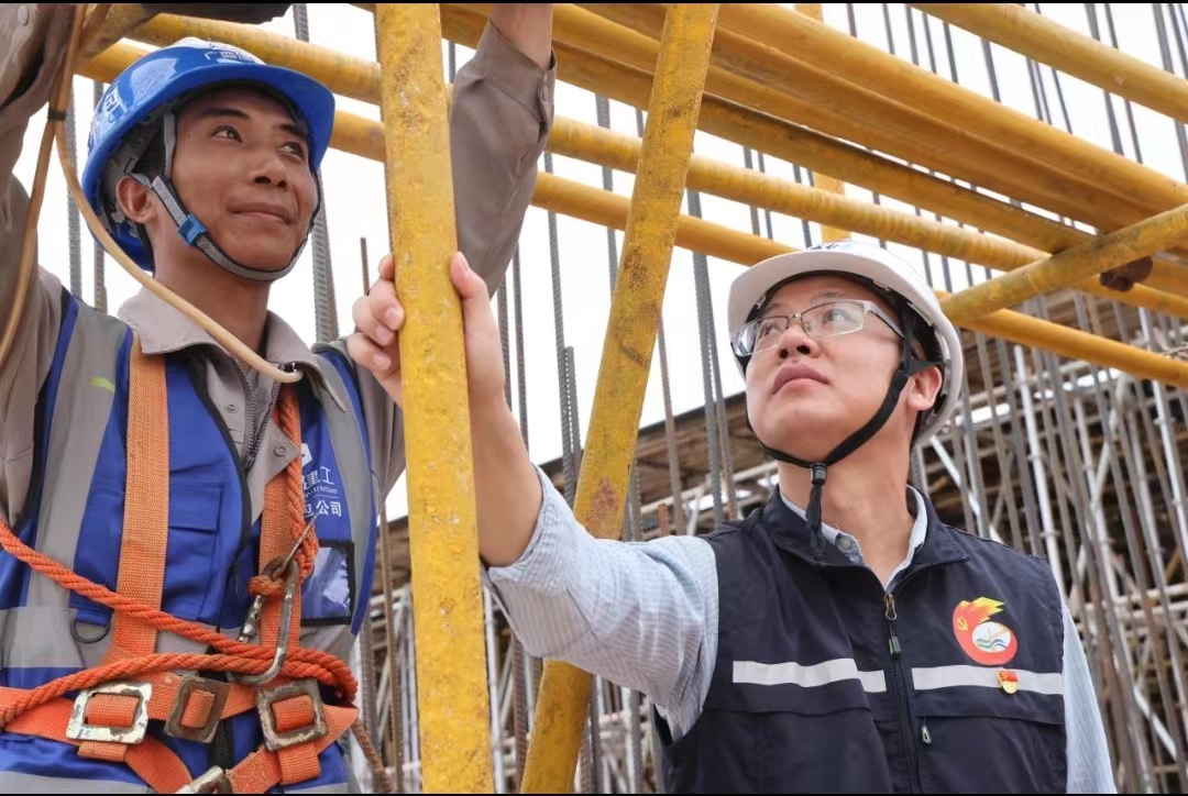 (“水工兵”建設(shè)先鋒隊(duì)隊(duì)員覃長(zhǎng)瑜(右)正一絲不茍地和施工方查看鋼筋綁扎情況)